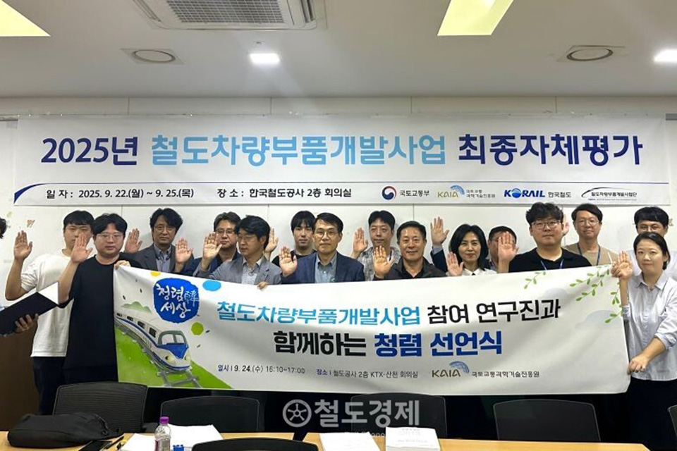 국토교통과학기술진흥원(KAIA)은 지난달 22~25일 국토부와 공동 지원하는 '철도차량부품개발사업'의 최종 자체평가를 실시했다. 이번 평가에서 KAIA, 한국철도공사(코레일), 참여 연구진, 평가위원들이 함께 '연구윤리·청렴 서약'을 실시했다.