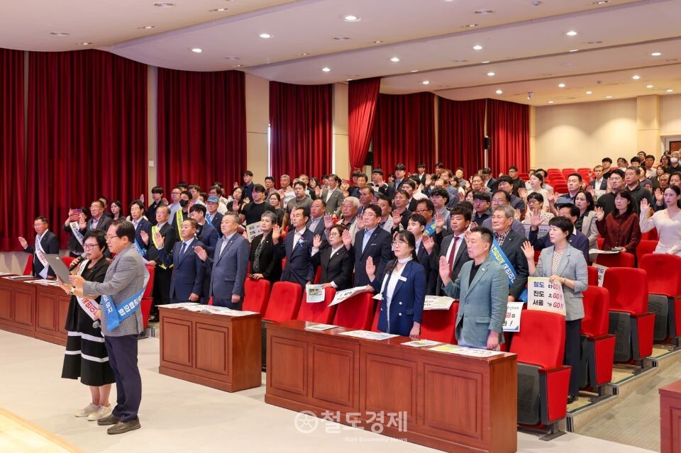 진도군은 최근 진도군청 대회의실에서 진도고속철도추진위원회가 주관해 '진도 고속철도 국가계획 반영을 위한 범군민 결의대회'를 성황리에 개최했다. 참석자들은 "진도군은 제주도와의 최단 항로이다"며 "육상과 해상을 연계한 교통 구축의 최적지이다"고 강조했다.