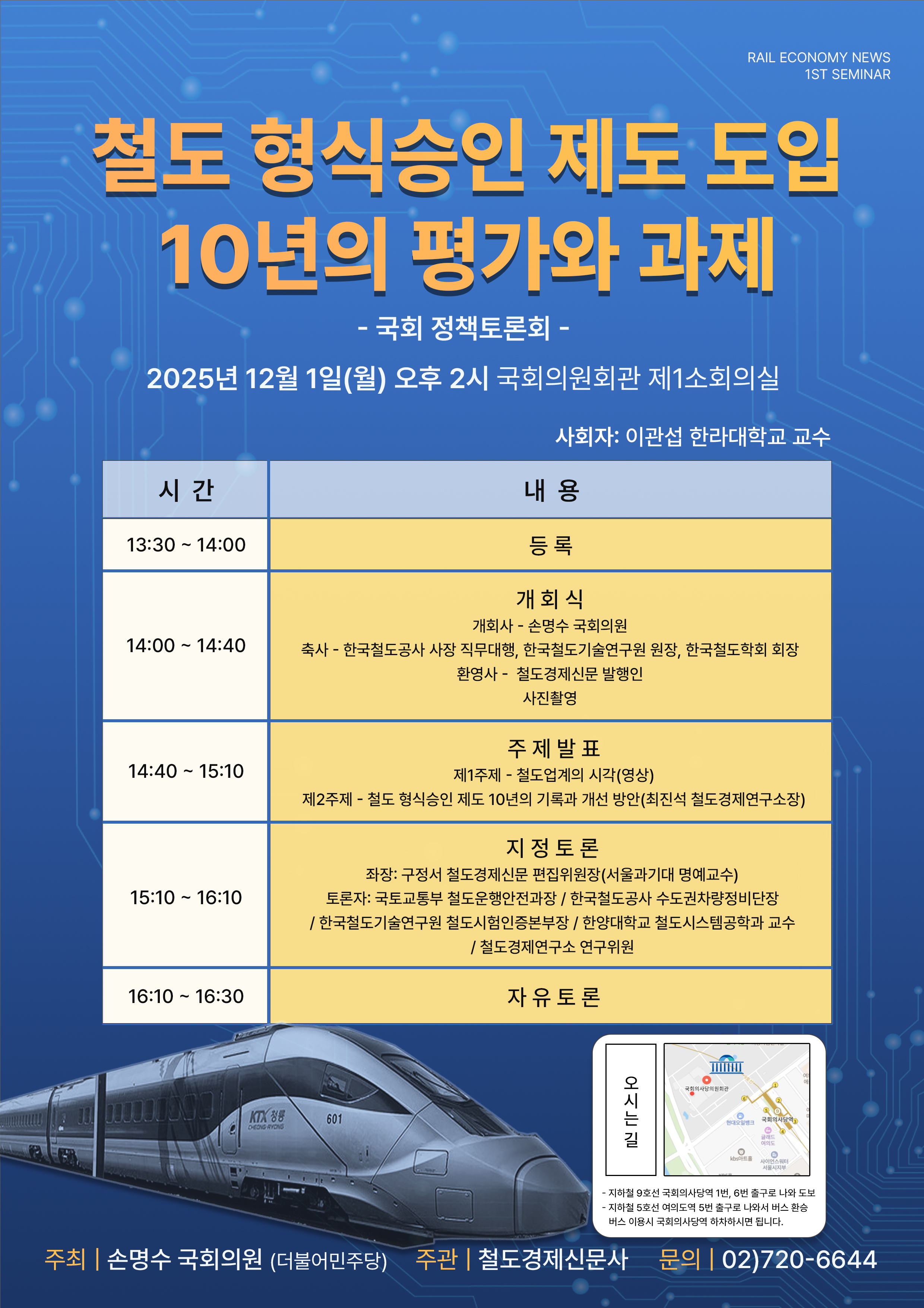 🚄 D-7! 철도 '형식승인 제도 도입 10년' 국회 정책토론회 사전 등록하세요!
