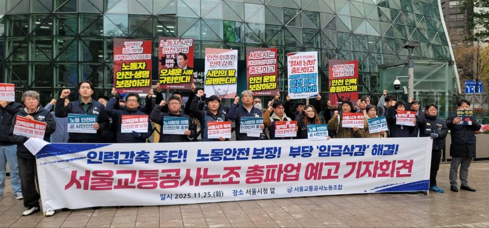 서울교통공사노동조합이 다음달 12일 전면 파업에 돌입하겠다고 발표했다. 파업이 현실화되면 공사가 운영하는 지하철 1~8호선 운행에도 차질이 생길 것으로 보인다. 노조 측은 "인력감축과 임금삭감 등의 문제로 파업을 결의하게 됐다"며 서울시가 노조의 요구에 응하지 않는다면 '최후 수단'으로 12일 총파업이 불가피하다고 밝혔다.