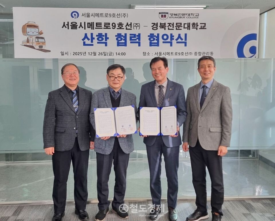 서울시메트로9호선과 경북전문대학교 철도전기기관사과는 지난달 26일 산학협력 협약을 체결했다. 양 기관은 철도산업 현장에 필요한 전문 인재 양성을 목표로 상호 협력한다.
