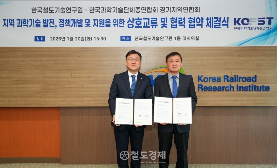 한국철도기술연구원은 한국과학기술단체총연합회 경기지역연합회와 지난 20일 경기도 지역단위 과학기술 발전, 정책지원을 위한 상호 교류협력 협약(MOU)을 체결했다. 양 기관은 이번 협약을 통해 경기도 지역 과학기술 발전을 위한 공동연구 개발 및 지원에 협력하기로 했다.